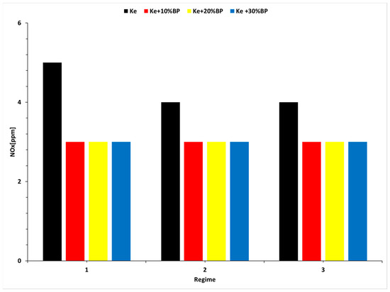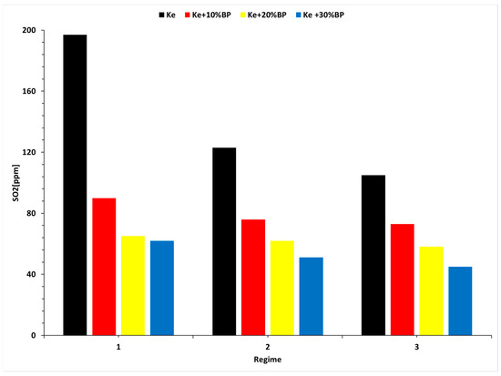 Regarding the SO2 concentration in gas emissions, there is a decrease in concentration for each regime with the increase in biodiesel concentration. Thus, in idle mode, the SO2 concentration for Ke was 197 [ppm], in regime 2, it was 123 [ppm], and in regime 3, it was 105 [ppm]. When 10% BP was added, for Ke, it was 90 [ppm] in regime 2 and 76 [ppm] in regime 3. When 20% BP was added, for Ke, it was 65 [ppm] in regime 2 and 62 [ppm] in regime 3. Finally, when 30% BP was added, for Ke, it was 62 [ppm] in regime 2, 51 [ppm] in regime 3, and 45 [ppm] in regime 3.
