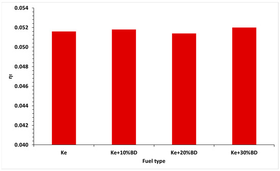 The thermal efficiency of an engine, a crucial performance metric, is defined as the ratio of the net rate of organized work output to the rate of thermal energy available from the fuel within the engine. This parameter, denoted by Equation (7), provides a quantitative measure of the engine’s effectiveness in converting thermal energy from fuel combustion into useful work output. Thermal efficiency is a key indicator in assessing the overall performance and energy conversion capabilities of the engine under consideration: