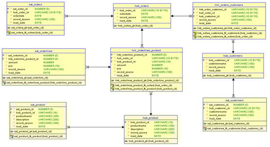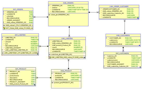 Figure 2 displays an exemplar data model for Data Vault 2.0, formulated using the source data shown in Figure 1. This data model follows the best practices of Data Vault 2.0 [4]. The data model consists of nine tables: three Hub tables, two Link tables, and four Satellite tables.