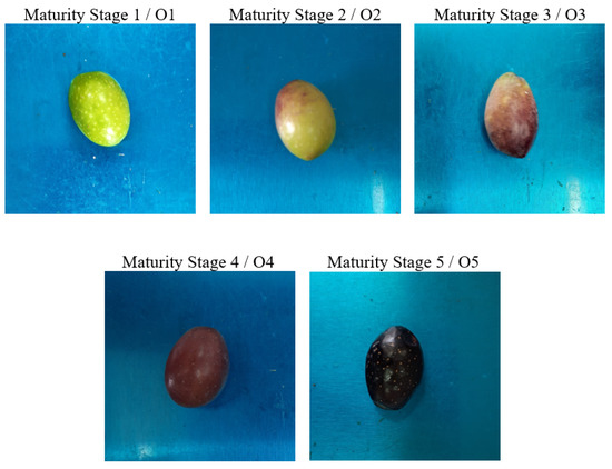 Adjusted images of the five ripening stages of Roghani olives under our study. Each class has been denoted by an assigned code (O1–O5).(Original pictures).