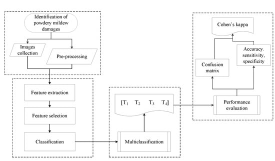The general scheme, which involves a machine learning approach for the early detection of PM damage, is shown in Figure 1. Image acquisition and preprocessing are the first steps, which are followed by a feature extraction process through texture descriptors. The application selects the optimal features based on a comparison test. Binary classifiers achieve multiclassification in combination with a voting scheme and SVM blocks. Finally, the performance is evaluated with parameters that determine the optimal classification of PM damage level in cucurbit leaves.