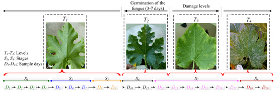 In Rivera-Romero et al. [16], a statistical analysis was conducted for determining a timeline (Figure 2) with sampling days and phenological growth stages with the visual assessment of PM signs and symptoms. At , leaf development (), lateral bud formation (), and inflorescence emergence () during the first nine sampling days () are considered. From to , between the main stages of flowering and fruit development ( and ), leaves with damage level are monitored. Leaves with damage level are found in the main stages of fruit formation () between and . The main fruit and seed growth and ripening stages are shown in and and in leaves at from to days of sampling. Four levels of PM damage are then defined (Figure 3): for healthy leaves, for leaves with germinating spores, for leaves with early symptoms, and for diseased leaves.