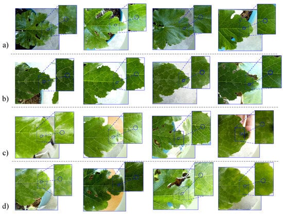 Visual evaluation of cucurbit leaves where four PM damage levels were defined: (a) : healthy leaves, (b) : leaves with spore in germination, (c) : leaves with the first symptoms, and (d) : diseased leaves.