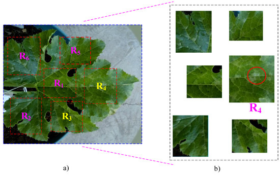 Exploration by parts of the leaf for the selection of the region of interest (ROI): (a) division of the leaf, central part (), lower right lobe (), upper right lobe (), upper central lobe (), upper left lobe () and lower left lobe (), (b) first symptoms at .