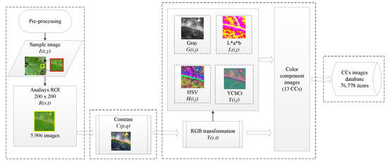 Preprocessing of the ROI images starting with the color transformation and separation of color components (CCs), where the sample image () is the original image, which is followed by the analysis of ROI results in a new sample in RGB (), then a contrast adjust () is performed to obtain the transformation of the image () in the different color spaces (, , , ) and the separation for color components.