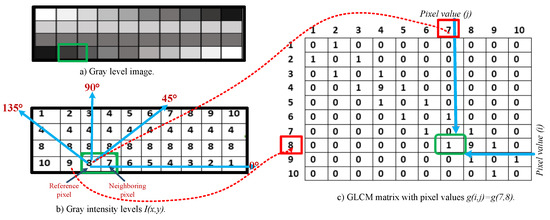 Figure 6 shows the computation of a GLCM matrix of an image with gray intensity levels, where the neighboring pixel pairs could be matched with four different reference angles (0°, 45°, 90°, and 135°). Figure 7 shows the GLCM matrices generated from the components in the HSV color space.