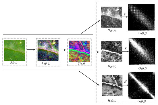 Processed image ( and ); color transformation (); components , , and ; and their GLCM matrices , , and with 255 gray levels.