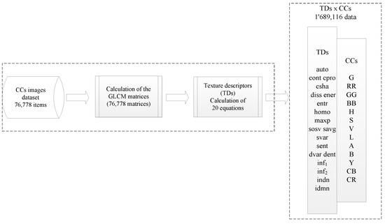 A total of 260 features (20 TDs × 13 CCs) were extracted from 76,778 GLCM matrices from the Color Component Image Dataset (CC-ID), which generated a texture dataset of 1,535,560, labeled as abbreviated texture descriptor names followed by the color component: DTs-CCs. An example is the texture feature diss “dissimilarity” and the blue component (BB) of the RGB color space image. The texture dataset was normalized using the minimum and maximum values of each row.