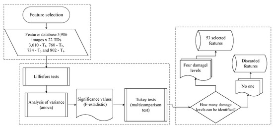 The feature selection process consists of finding the best set of features that allows us to differentiate the four levels of damage. Statistical methods are used for the selection process, the flow diagram of which is shown in detail in Figure 9 [16].