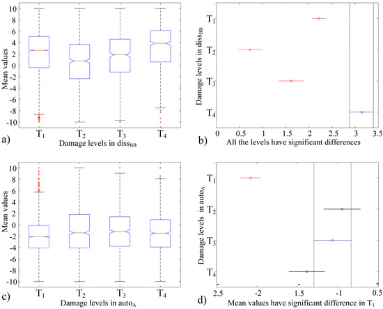 Results of the ANOVA and Tuke’s test: (a) mean values of the damage levels of diss-BB; (b) Tukey’s test, where the means of the damage levels are significantly different; (c) mean values of the damage levels of auto-A; (d) Tukey’s test, where the means of , , and are equal but significantly different from .