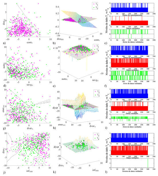 The main objectives of the proposed framework are to implement support vector machines (SVMs) to classify PM damage levels (–) and predict the early phase. In addition, a multiclass problem is found in multiple binary classification cases, called one-vs.-one, resulting in a class comparison between each class. A block multiclassifier with binary classifiers (SVMs) was constructed, where k is the class number. An SVM is trained with different kernels (polynomial, sigmoidal, and radially-based Gaussian functions) to find the optimal hyperplane [23]. Hyperplane minimizing and estimating h are performed using , where R is the diameter of the smallest sphere including all training data, and is the vector of standard Euclidean weights. Therefore, an SVM classifies correctly when the parameters (confidence interval) and working with different values are minimied. In this study, 60% of the data were used for the training and validation, and 40% were used for the test. Six binary SVMs () were trained with their corresponding two different classes of input data for all the feature vectors defined above. Table 5 and Table 6 show the results for the SVMs trained with feature vectors whose components belong to different color spaces , and the same color space , respectively. In both tables, p is the degree of the polynomial, is the variable parameter for the sigmoidal function, and is the parameter for the radial basis function. The selected SVMs were those with the minimum values. The 2D graphs and 3D hyperplanes; and training, validation, and error results with different kernels and feature vectors are described in Figure 11 and Figure 12, respectively.