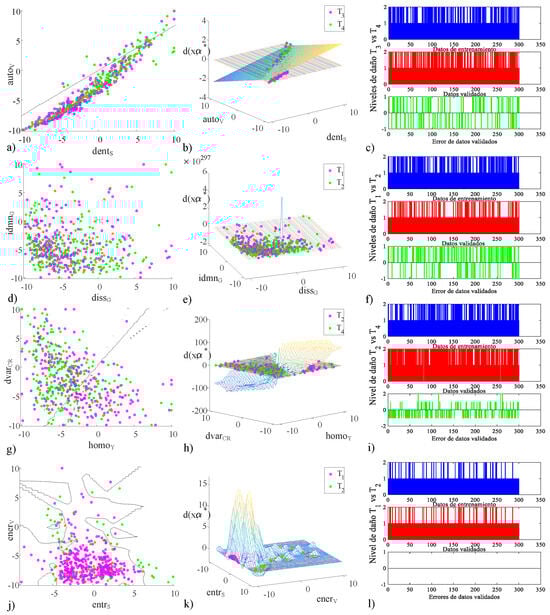 Kernel selection in the multiclassification system with the feature vectors in different color space with the optimal hyperplane: (a) radial base function kernel in 2D with auto versus dent, (b) 3D optimal hyperplane, (c) training and validating data with the error in the SVM versus , (d) linear kernel in 2D with idmn versus diss, (e) 3D optimal hyperplane, (f) training and validate data with the error in the SVM versus , (g) polynomial kernel in 2D with dvar versus homo, (h) 3D optimal hyperplane, (i) training and validate data with the error in the SVM versus , (j) radial base function kernel in 2D with ener versus entr con kernel RBF, (k) 3D optimal hyperplane, and, (l) training and validate data with the error in the SVM versus .