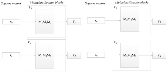 One-versus-one multiclassification method. The main inputs are the support vectors ), the validation data for each binary classifier , and . Each block contains the different support vector machines for multiple classification.
