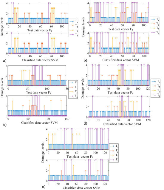 where natural values in are 0.5, 1, and 2, which was settto 1 in this case. Of the total of all the tests, the obtained metrics for system performance evaluation (percentages of , , , , , and ) are shown in Table 7 and Table 8. From the classified data from each test, we defined the confusion matrix (), where the rows (n) indicate the damage levels, and the columns (m) are the classes provided by the model. From this matrix, we can see when one class is confused with another. The diagonal components contain the sum of all the correct predictions, and the other diagonal components reflect the errors of the misclassified data [24,25]. Cohen’s kappa coefficient (Equation (9)) is a statistical measurement of the interevaluator agreement for qualitative data or categorical variables. Its use in feature selection is suitable for testing the performance of models [28,29].