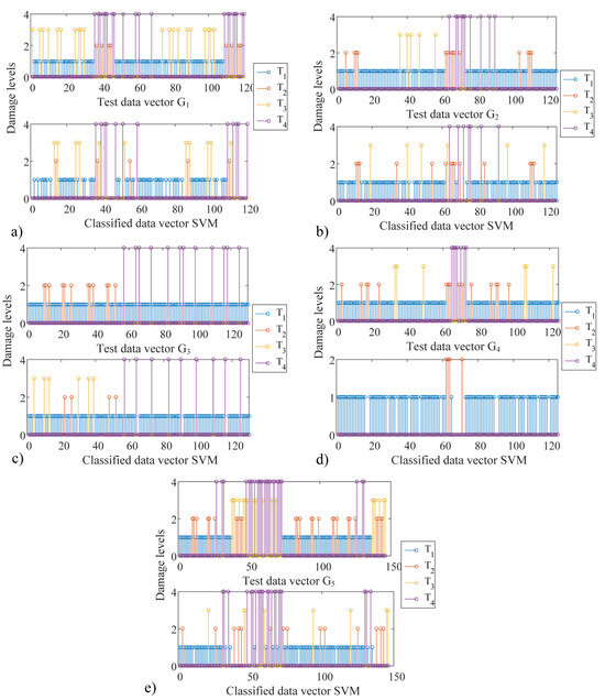 SVM binary classifiers: (a) test data and SVM-classified data, (b) test data and SVM-classified data, (c) test data and SVM-classified data, (d) test data and SVM-classified data, and (e) test data and SVM-classified data.