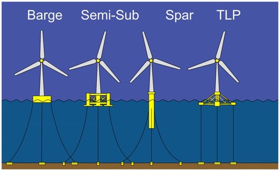 Figure 1 shows the most widely used bottom-fixed and floating wind turbine concepts, which are bottom-fixed monopile, floating wind spar, semi-submersible, and TLP platforms. More details about these concepts, including their advantages and disadvantages are presented in Section 4 and Table 1.