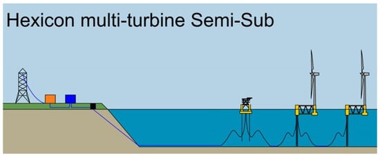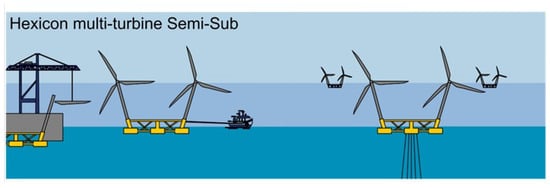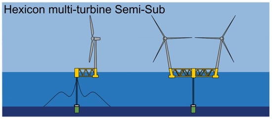 One of the most widely used multi-turbine floating wind concepts is the HEXICON multi-turbine semi-submersible [] which was designed by HEXICON and is made of steel. W2Power [] and Floating Power Plant [] are multi-turbine concepts that are made of steel and were developed by EnerOcean and Floating Power Plant, respectively.