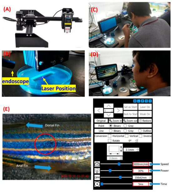 Previous skin wound-healing experiments performed on fish, mostly using expensive dermal lasers or biopsy punches for skin wound generation, resulted in drawbacks, like high cost and operational difficulty, when using small-sized fish. To simplify this operation, establishing an alternative instrument/method to replace the dermal laser or biopsy punch was necessary. To achieve this purpose, a laser engraving machine (Zgenebio Inc., Taipei, Taiwan (https://www.zgenebio.com.tw/english.html) (accessed on 29 January 2024)) was tested in this study for the first time. The laser engraving machine was originally used to engrave wood or other material surfaces to the desired shape, which was equipped with a 10-watt (W) high-power CO2 laser. This laser engraving machine consists of an XY motorized stepper that is able to precisely control the XY position of the laser beam (Figure 1A). The laser power and XY position of the laser beam can be precisely controlled by the operation software to create skin injury with a high precision and consistent size and depth. One endoscope was used to monitor and record the skin ablation process with details (Figure 1B). In addition, a digital dissecting microscope purchased from Andonstar Tech Co. (Shenzhen, Guangdong, China) was used for easy wound-size recording and visualization (Figure 1C,D). As mentioned earlier, the machine came with the Mini engraving software (Figure 1E). The software was able to control the laser beam and XY motorized steeper by adjusting some important parameters, like the laser power (indicated by watt), wound size (mm), wound shape, and the duration of laser ablation(s) (Figure 1E).