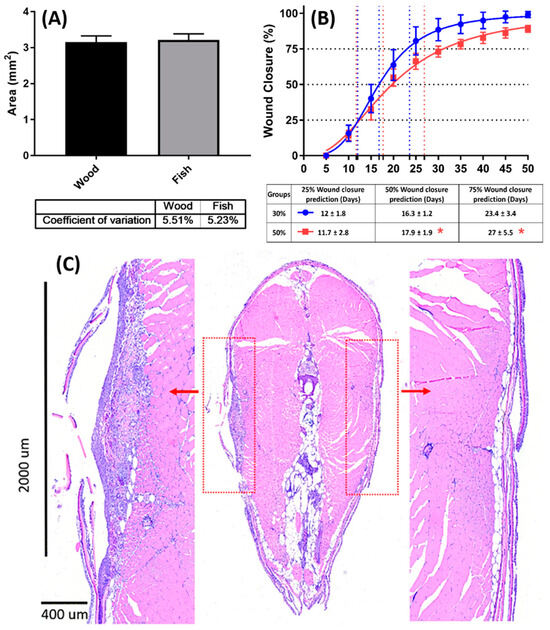 Wound-area and wound-closure percentage on zebrafish using the laser engraving machine. (A) Test for the consistency of the wound area created by the laser. Before the experiment, the wound size was first tested on wood, and later tested on the fish skin. The data are expressed as mean ± SD and were analyzed by an unpaired t-test. (B) Time chronology of the skin wound-area recoveries of the zebrafish. The data are presented as mean ± SD, n = 10 for each group (* p < 0.05). The data were tested using nonlinear regression to obtain the 25%, 50%, and 75% wound-closure prediction. (C) Skin wound histology in the paraffin section with H&E staining. The left side shows a skin wound and the right side shows the unwounded control. The full-thickness skin wound after receiving a 3W laser was estimated as 2000 μm in width and 400 μm in depth.
