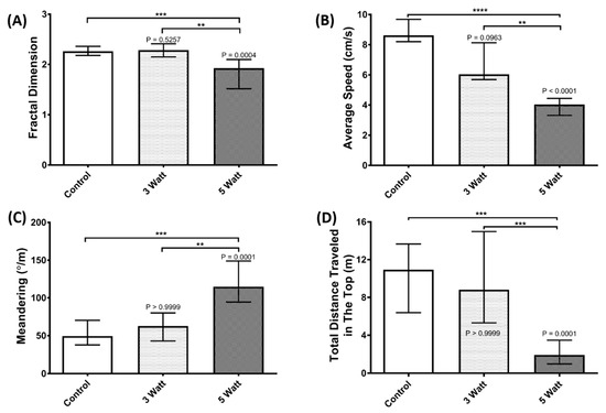 Behavior endpoints were obtained from the 3D locomotion assay of zebrafish after 1 h of skin ablation with either 0 (control), 3, or 5 watts of power. (A) Fractal dimension, (B) average speed, (C) meandering, and (D) total distance traveled at the top were calculated. The data are expressed as the median with the interquartile range, and were analyzed by the Kruskal–Wallis test, followed by Dunn’s multiple comparisons test. Two replicates with a total sample size of 12 fishes were applied in this experiment (** p < 0.01; *** p < 0.001; **** p < 0.0001).