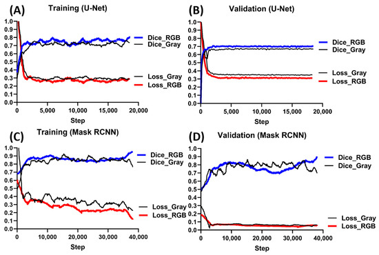 Training loss and test Dice curves for skin wound-closure prediction by using either U-Net or RCNN. In total, 885, 97, and 89 images were used as training, validation, and testing datasets, respectively, to conduct deep learning-based wound-size prediction. To increase image diversity, images were distorted about 14-fold to generate a total of 12,390 images as a training dataset. (A) The Dice and loss curves for the U-Net training process by using gray or RGB skin images. (B) The Dice and loss curves for the U-Net validation process by using gray or RGB skin images. (C) The Dice and loss curves for the Mask RCNN training process by using gray or RGB skin images. (D) The Dice and loss curves for the Mask RCNN validation process by using gray or RGB skin images.