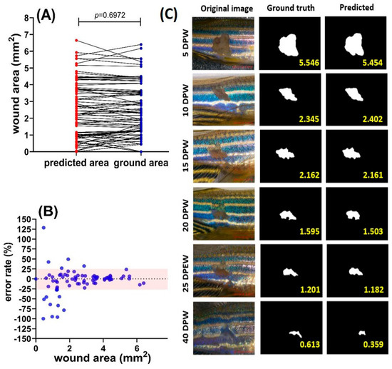 For the PET strain, based on the U-Net, a very good performance on skin wound-size prediction was observed when compared to the ground truth. Based on 89 images collected from zebrafish by 5 to 50 DPW, it was revealed that there was no significant difference between the ground truth and prediction, which was validated by using a paired t-test (p = 0.6972, Figure 6A,C). Later, we investigated whether the U-Net network prediction power displayed any consistency for different sizes of wounds. By using the XY correlation plot, it was revealed that the prediction error rate displayed a relatively low level for bigger skin wounds and a high level for smaller skin wounds (Figure 6B). For middle-to-big wound (>2 mm2) area prediction, the error rates were less than 25%, while they could reach around +125% to −100% for small wounds of less than 2 mm2. Figure 6C shows some examples of the ground truth and predicted area comparisons at different time points after the skin ablation. Taken together, the optimized U-Net performed very well for the skin wound-area and morphology prediction. Only significant over- or underestimation was found in very small skin wounds. Those errors can be ignored, since they contributed less to the skin wound-closure percentage, which is divided by the relatively big wound skin at 5 DPW.