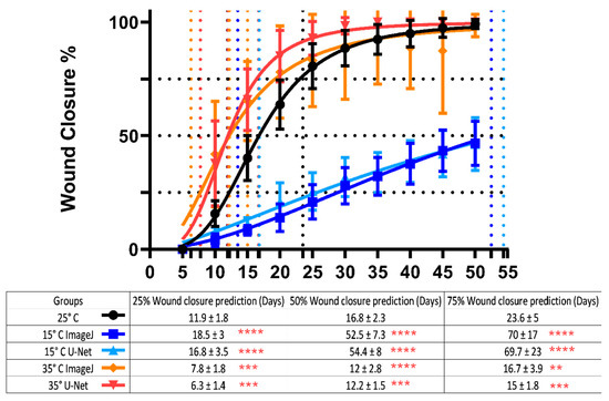 Other than the 50% wound prediction, in this study, we also proposed another two important endpoints of either 25% or 75% wound closure that could be used to fully cover the early (25%), middle (50%), and late (75%) wound-closure events for re-epithelialization and inflammation, granulation tissue, and the maturation process. By using the curve-fitting method, we found it was very useful for performing skin wound-closure evaluation by using this multiple-endpoints method. Basically, skin wound-closure kinetics obtained by the U-Net prediction and manual measurement using ImageJ were consistent, showing faster wound closure in the higher-temperature group and much slower in the low-temperature group (Figure 7). Low temperature has been reported to delay tissue necrosis, macrophage response, the clearance of bacteria, and finally slow down skin wound closure [58]. The time for skin to reach 50% of the wound closure was also investigated. The high-temperature (35 °C) condition could speed up the wound healing, taking ~12.2 days to reach 50% wound closure, while it took ~16.78 days for the control and ~54.4 days for the low-temperature group (the p value for each significance level was * p < 0.05; ** p < 0.01; *** p < 0.001; **** p < 0.0001). This means that the 15 °C condition delayed the wound-healing process significantly, as 50 days were needed for the zebrafish to reach a 50% wound-closure condition. Furthermore, by evaluating the 25% wound-closure endpoint, we could check their early wound-healing process. It took ~6.3 days for the high-temperature group (35 °C), ~11.9 days for the control, and ~16.8 for the low-temperature group (25 °C). We can see that, even in the early wound-healing process, temperature already played an important role. High temperatures were significantly faster compared to the other group, while low temperatures already took a lot of time to close the wound (Figure 7). These results clearly demonstrate that skin wound healing in zebrafish is temperature-dependent, and the ambient water temperature should be well controlled and reported when conducting such experiment for better data consistency. In addition, it also can significantly save time to conduct faster wound healing-potential evaluation by assessing the early 25% wound-closure endpoint. By performing the 25%, 50%, and 75% wound-closure testing, this protocol could help us to choose which process of early, middle, or late wound healing we want to focus on. Furthermore, the performance of the AI developed for wound measurement is working great, as the results are still comparable to each other.