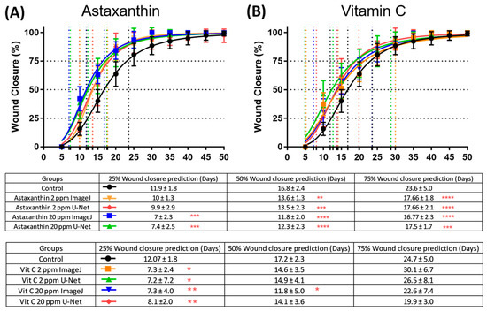 Validation of antioxidants as a strong positive control to promote skin wound healing in zebrafish after performing laser ablation. (A) Wound-healing closure percentage curve of zebrafish treated with both high and low doses of astaxanthin. (B) Wound-healing closure percentage curve of zebrafish treated with both high and low doses of vitamin C (ascorbic acid). The data are presented as mean ± SD. The data were tested using nonlinear regression to obtain the 25%, 50%, and 75% wound-closure predictions. For statistical differences, the data were tested by a two-way ANOVA with the Geisser–Greenhouse correction. Sidak’s multiple comparison tests were used to compare all treatments with the control, with n = 12 for each group and each concentration (* p < 0.05; ** p < 0.01; *** p < 0.001; **** p < 0.0001).
