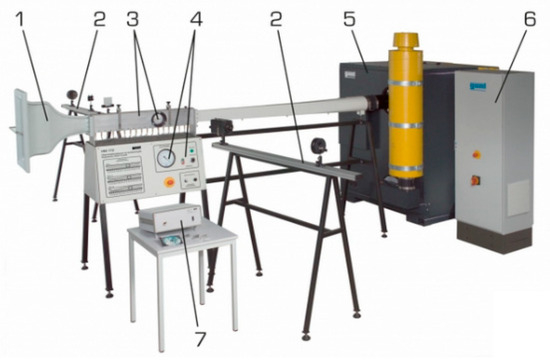The facility comprises the following components as presented in Figure 5: a wind tunnel duct, air inlet and inlet honeycomb (1); Schlieren optics system (2); measuring section with optical access by two 11 cm quartz windows (3); control panel with a safety shut down button and manometer (4); fan (5); switch power supply cabinet (6); digital scanning valve for pressure profile along the bottom wall of the wind tunnel (7).