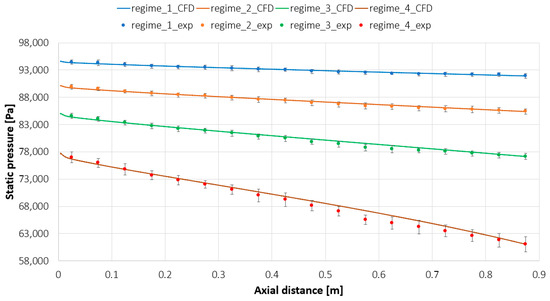 In Figure 7, a comparison is presented between the experimental and numerical results for the bottom wall static pressure for the four regimes. The experimental pressure measurements were averaged over 20 s (20 samples at a 1 Hz acquisition rate). Utilizing the t-student distribution table for 20 samples, a t-student coefficient of 1.725 was applied for estimating a 90% confidence interval [41].