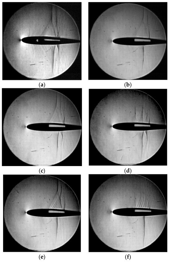 Schlieren images: (a) Model A1; (b) Model A2; (c) Model A3; (d) Model A4; (e) Model A5; (f) Model A6.