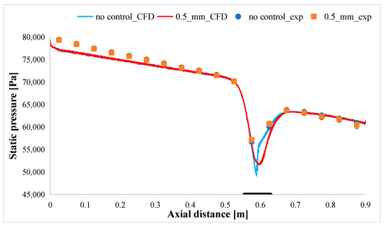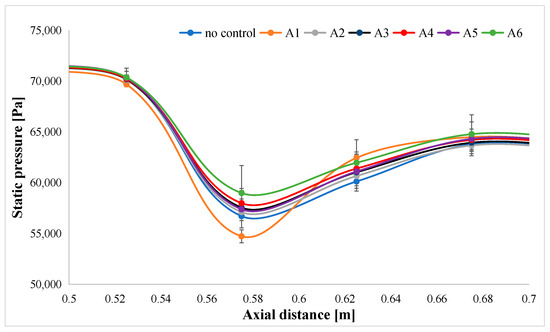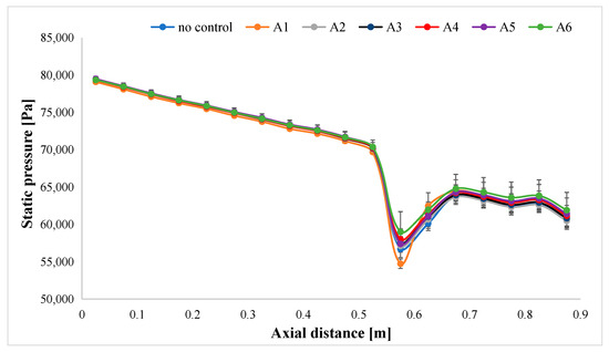The static pressure distribution on the bottom wall of the wind tunnel is illustrated in Figure 9 and Figure 10 for seven distinct experiments. In the ‘no control’ scenario, the unaltered airfoil surface on the lower side is oriented towards the bottom wall of the wind tunnel, where static pressure taps are installed. For the other six tests, labeled A according to Table 1, the perforated plate with varying hole sizes is also placed on the lower side, facing the bottom wall. This configuration facilitates a comparison of the static pressure distribution on the bottom wall with and without the incorporation of the passive control method.