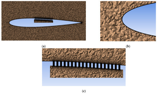 For numerical validation, the A2 model was simulated in Ansys FLUENT utilizing a steady-state density-based solver to solve the flow equations, coupled with the k-ω SST turbulence closure model. Given the intricate nature of the computational domain, particularly regarding the passive control implementation (small diameter holes requiring discretization), Ansys Meshing was used for unstructured grid generation. Blade wall and wind tunnel wall inflation techniques were applied to locally refine the mesh, aiming for an accurate representation of the boundary layer, targeting a y+ value of 1. The Body of Influence method was employed to further refine the mesh in the airfoil proximity, while a sizing feature was used to enhance the grid resolution in the vicinity of the holes to accurately capture the induced recirculation flow in the cavity beneath the blade surface. Specifically, a fixed number of 50 elements was imposed on the hole diameter. The static pressure at the outlet patch was set to the value measured experimentally in the wind tunnel. Starting from the ambient pressure, the inlet total pressure was estimated using the total pressure loss on the honeycomb. The detailed figures for the imposed boundary conditions are reported in Table 3. The turbulence intensity on both inlet and outlet patches was set to 1%, while the estimated turbulent length scale was 0.2 cm using the same approach as before for the empty wind tunnel simulations. The computational grid, consisting of 35 million elements, is shown in Figure 11.