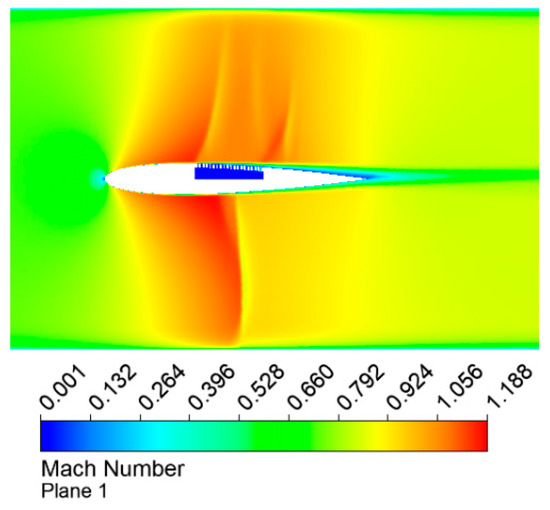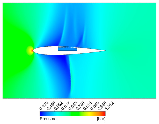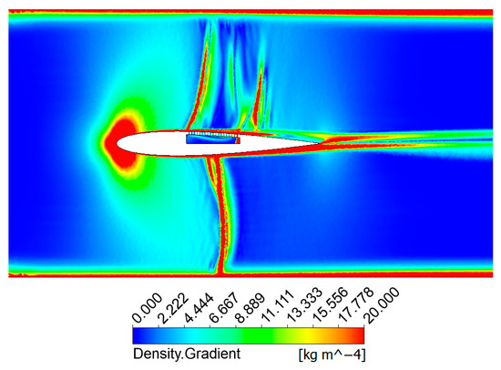Figure 12, Figure 13 and Figure 14 depict the density gradient, Mach number, and static pressure distributions in proximity to the airfoil. One has to mention that for this simulation, the lower side surface is unaltered and will be referred to as ‘no control’, while the upper side incorporates the perforated plate with a cavity underneath (0.5 mm holes), referred to as ‘passive control’.