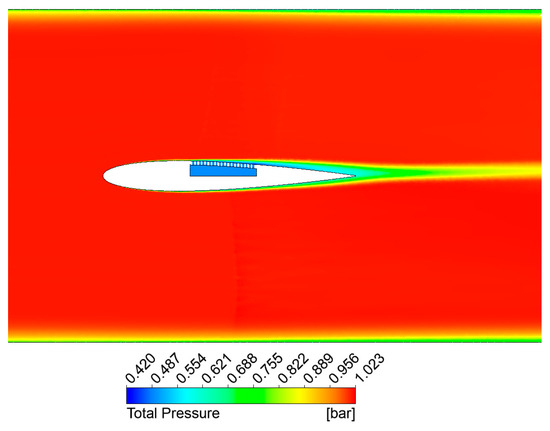 In Figure 12, the density gradient plot reveals a normal shock wave for the lower side (no control), and an emerging ‘lambda’-type shock structure on the upper side (passive control applied). Additionally, on the upper side, an additional shock wave appears at the end of the perforated cavity. The presence of a shear inside the cavity confirms the existence of a recirculation flow inside. An observed boundary layer thickening above the perforated plate suggests potential additional viscous losses due to localized increased apparent roughness. The normal shock on the lower side and its ‘lambda’-type alteration on the upper side are highlighted by the Mach number in Figure 13 and the static pressure in Figure 14. From the total pressure plotted in Figure 15, it can be observed that the porous wall leads to minor pressure losses. This implies that the porous material has minimal impact on energy loss within the airflow. This is a promising result as it indicates that the porous walls effectively serve their purpose without substantially compromising the airfoil’s aerodynamic performance.
