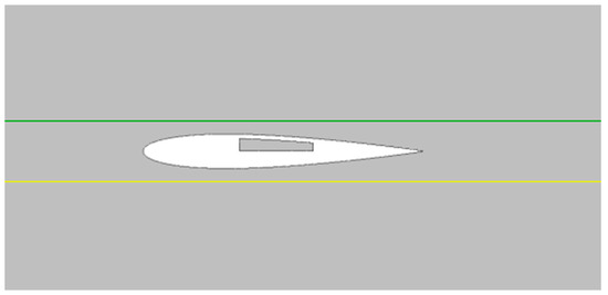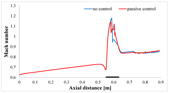 Reference lines are depicted in Figure 16 to facilitate the plotting of flow quantities in the axial direction. The yellow line (lower side) is indicative of the ‘no control’ case, while the green line (upper side) is representative of the ‘passive control’ case.