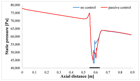 Examining the static pressure in Figure 17, the minimum pressure in the passive control scenario is slightly higher (around 2000 Pa) compared to the ‘no control’ region of the airfoil. Additionally, the substantial pressure gradient observed in the ‘no control’ case is replaced by a series of recompressions in the passive control case. These recompressions exhibit weaker magnitudes and smaller slopes. The same trend is highlighted in the Mach number plots in Figure 18, where the passive control exhibits reduced slopes and magnitudes for the Mach number decrease.