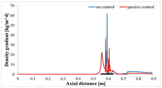 In the density gradient plot (Figure 19), the incorporation of the perforated plate reduces the maximum density gradient in the ‘no control’ case by over 30%. The presence of the second shock wave at the end of the perforated plate, as explained in Figure 12, is corroborated by the Mach and density plots in Figure 18 and Figure 19. The magnitude of this second shock is comparatively reduced.
