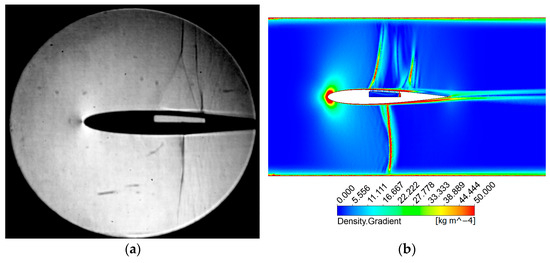 A2 model airfoil—experiment vs numerical simulation. (a) Experimental Schlieren; (b) numerical Schlieren.