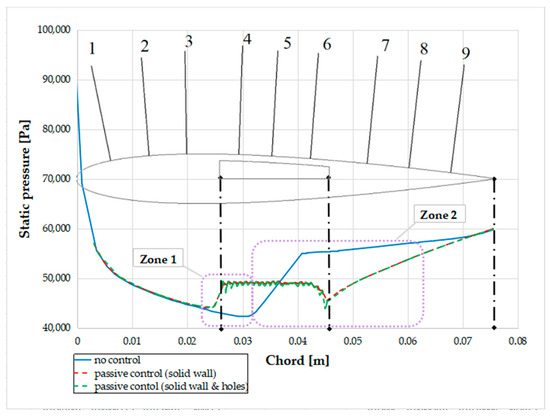 The CFD static pressure distribution on the airfoil is plotted in Figure 22. The ‘no control’ curve refers to the upper side of the baseline airfoil, while the ‘passive control’ curve refers to the upper side of the airfoil with a 0.5 mm hole passive control perforated plate. By ‘solid wall’, one understands the distribution in between the holes’ rows, while by ‘solid wall & holes’, one refers to the mid row of holes. There is very little difference in the passive control curves, especially at the edges of the perforated plate. The position of the shock wave in the baseline case is identified by the large gradient close to 0.03 m coupled by a strong static pressure drop. For the passive control case, the perforated plate introduces a plateau in static pressure. The cavity also changes the structure and the position of the previous normal shock towards the leading edge.