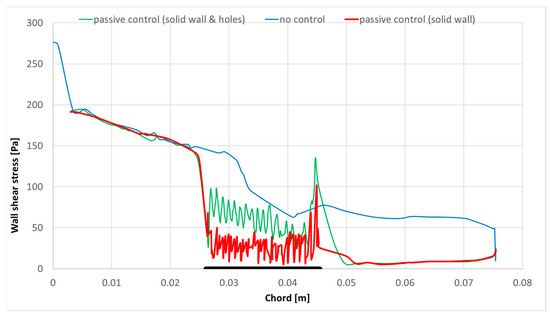 CFD results for wall shear stress on the airfoil. The perforated plate length for the ‘passive control’ case is highlighted in black.