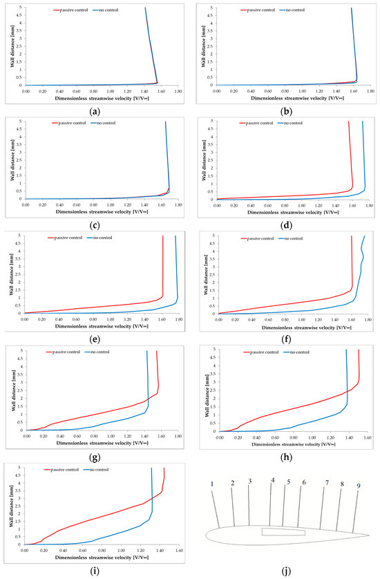 The dimensionless streamwise velocity profiles were extracted from CFD in Figure 24 for nine rakes along the airfoil chord for both the upper side of the baseline airfoil and the upper side of the passive control airfoil. The relative position of the rakes with respect to the airfoil is presented in Figure 24j where three rakes are upstream of the cavity, three rakes are within the cavity and three rakes are downstream of the cavity. The reference value for the velocity is 208 m/s (taken from Table 3). For the first three rakes positioned upstream the perforated plate (Figure 24a–c), no significant differences can be observed in the velocity profiles between the baseline and the passive control case. For the three rakes within the cavity region, the velocity profiles have different slopes as the cavity blowing phenomena thickens the boundary layer in the passive control case. The flow is slightly slowed down in the passive control case due to the interaction with the blowing cross flow in the fore part of the cavity. Downstream of the cavity, the flow in the passive control case slightly accelerates as an effect of the boundary layer thickening and a reduced effective cross section flow area. The passive control profile is less ‘filled’, which is another indication of the boundary layer thickening.