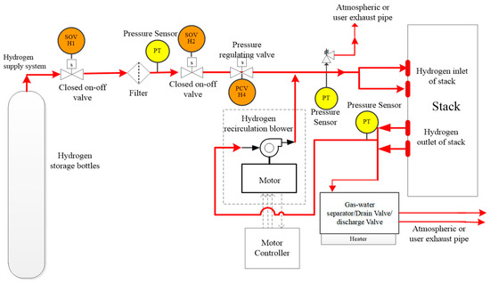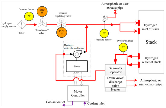 The purpose of the recirculation mode is to recirculate the excess hydrogen at the anode outlet back to the anode inlet to continue the electrochemical reaction. This mode improves the utilization rate of hydrogen and discharges the accumulated water and impurity gas at the anode to ensure the efficient operation of the stack. The process of hydrogen recirculation not only improves the utilization rate of hydrogen, but also prevents flooding and guarantees the life span of PEMFCs. Furthermore, it does not cause safety risks to the environment [13,14]. Currently, the hydrogen recirculation mode is the most widely used method in PEMFC vehicles. As shown in Figure 1, hydrogen recirculation is achieved via a hydrogen recirculation pump (HRP). Although the recirculation mode improves the hydrogen utilization efficiency, it increases the quality requirement and cost of the PEMFC due to the addition of auxiliary hydrogen recirculation equipment.