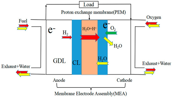 The working principle of a PEMFC is shown in Figure 2. Hydrogen and air enter the anode passage and the cathode passage through the intake pipe, respectively. The gas involved in the reaction reaches the proton exchange membrane through the diffusion layer on the electrode. On the anode side of the membrane, hydrogen is dissociated into hydrogen ions and electrons under the action of the catalyst, and hydrogen ions form hydronium ions in the carrier of water and reach the cathode through the PEM, thus completing the proton transfer process [7,8,9,10,11,12,13]. The anode reaction equation is as follows: