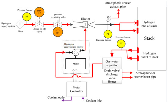 In this study, a 110 kW functional prototype PEMFC was built to facilitate the arrangement of different hydrogen recycling schemes. Pressure sensors were installed at the inlet and outlet of the stack to analyze and study the performance of the PEMFC. The schematic diagram of the functional prototype is shown in Figure 3.