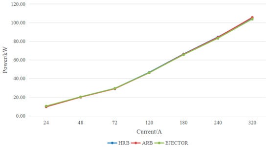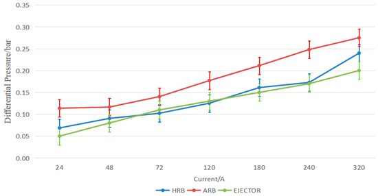 - At the 24 A current point, the pressure differential order is as follows: ARB scheme > HRP scheme > ejector scheme;