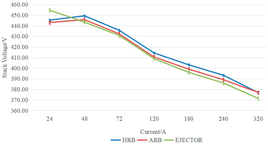 - At 320 A, the following order in observed: the PEMFC stack voltage of the HRP series ejector combination scheme > HRP scheme > ejector scheme. At this current point, the ARB is still running, but the power is reduced to about 9 W. This shows that the high-pressure differential of the HRP series ejector combination scheme has a positive effect on the stack voltage at a high current point.