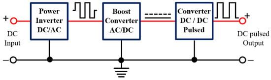 The design and construction of an HVDC power supply for high voltage generation can be performed using multiple methods, such as the Cockroft–Walton voltage multiplier [,], Dickson voltage multiplier [,], Delon charge pump circuit [,] half-wave and full-wave voltage doubler [,], as well as voltage triples and quadruples [], and so on. Voltage multiplier circuits are essential components in various research and technology devices, including HVDC generation. These circuits utilize diodes and a capacitor to produce a direct current (DC) output voltage that is multiple times higher than the maximum peak value of the alternating current (AC) input voltage. To provide an increase in voltage, first, a voltage inversion stage is built, followed by a voltage multiplying stage, and finally a load control stage. Figure 1 shows a diagram of the HVDC generation through the inverting and voltage multiplication circuit.