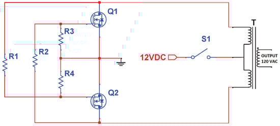 A voltage inverter is a key component in the electrical power system. Adjustable speed drives [], uninterruptible power supplies [], electric vehicles [] and the integration of renewable energy generation in power systems [] are some areas where voltage inverters are deployed. There are different types of voltage inverters on the market, but these are expensive, and the circuits are complex. Hence, for the construction of an HVDC, the first stage consists of a voltage inverter that is simple to manufacture and inexpensive. Its main components are a centre-tapped transformer (T), two power MOSFETs (Q1, Q2), four resistors (R1–R4) and a DC power supply (12 V/1.25 A) as shown in Figure 2.
