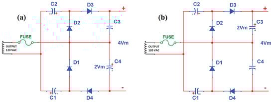 By boosting the peak voltage to two, three, four or more times the rectified peak voltage, voltage multiplier circuits can generate a relatively large peak voltage with a very low power capacity []. A voltage quadruple circuit, as seen in Figure 3, produces a DC output voltage that is four times the primary AC voltage peak value. During the primary transformer’s positive half-cycle, the capacitor C2 charges through diode D2 to peak voltage (Vm). Additionally, if the capacitance values of the capacitors are the same, capacitor C1 charges to Vm trough diode D4. It is worth mention that capacitor C1 charges to Vm with the opposite polarity compared to C2. Figure 3a displays the charging voltage and polarities of capacitors C1 and C2, at this half-cycle. In the negative half-cycle of the input transformer voltage, C3 charges through D3 and the voltage of C2 adds with that of the transformer, thus charging C3 to 2 Vm through D3 and discharging C2 in the process. In a quite similar way to the previous step, during this half-cycle, C4 charges through D1 and the voltage across C1 adds with that of the transformer, thus charging C4 to 2 Vm through D1 and discharging C1 in the process. The charging voltages and polarities of capacitors C3 and C4, at this half-cycle, are depicted in Figure 3b. At this point, the output voltage across C3 and C4 is 4 Vm. During the ensuing positive half-cycle, the charge on capacitors C2, C1 is replenished. The charge on C4 and C3 is replenished by the subsequent negative cycle. The voltage rating of C1 and C2 must be greater than Vm, while that of C3 and C4 must be greater than 2 Vm. Every diode needs to have a voltage rating greater than 4 Vm.